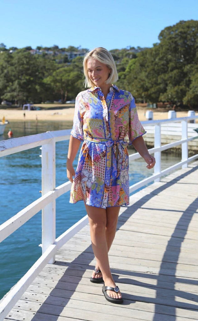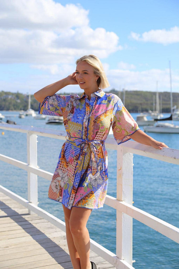 Dress. 100% Rayon. Collared dress, button through with waist tie. Blue edging on collar, hem, down front and on tie.