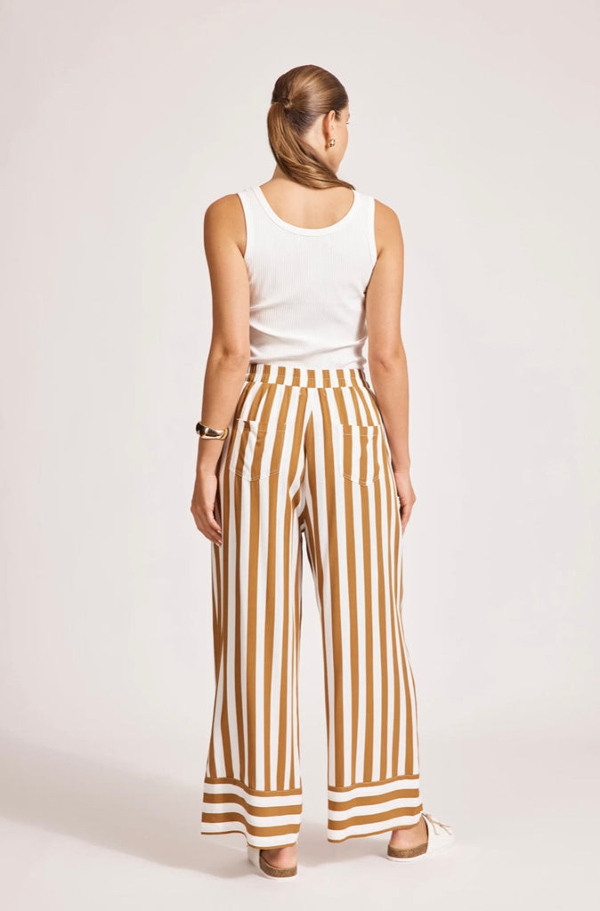 A statement essential. Made from washed rayon for a lightweight, draped feel. Features an elastic waist, side and back pockets, and contrast stripe detail at the hem and pocket edges.