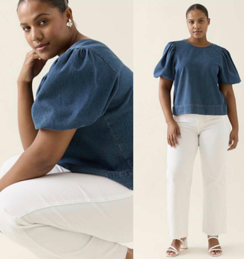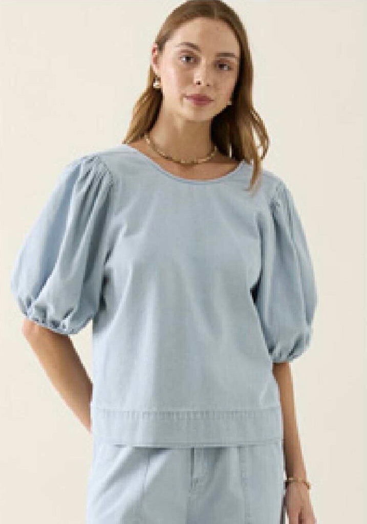 Denim Top, 100% Cotton. Round neck with low back neckline, elastic puff sleeve, deep hem detail.